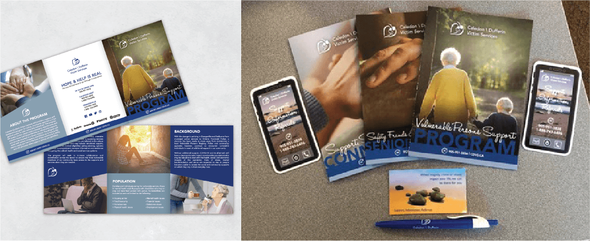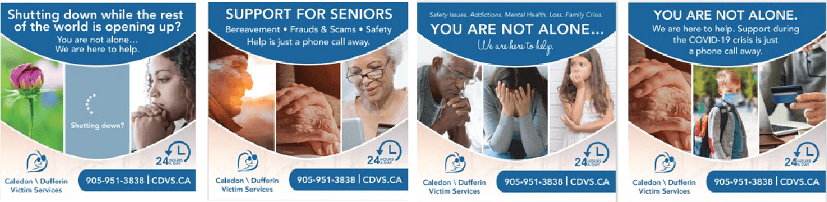 No one plans to be a victim! Our focus at CDVS is to ensure that no one has to deal with a crisis alone. We continue to commit to ensuring that even the most vulnerable members of society including seniors and youth, have the supports, information and referrals they need when they need it most. Our new program information was provided in the form of brochures distributed to victims, their families and police with a community wide targeted mailout campaign that reached social services, local agencies & community organizations ensuring maximum distribution in a safe and convenient manner. Over 43 packages were mailed out across all of Dufferin County. Additionally, over 50 CDVS crisis responders have access to the provided resources materials for distribution to clients and their families.